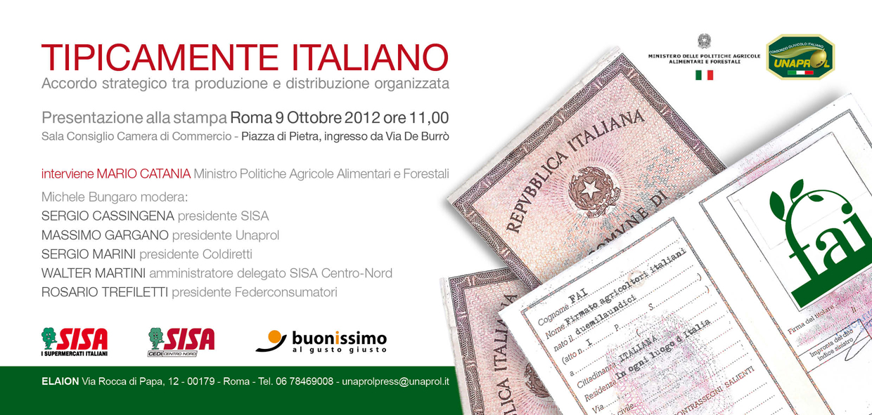 Si tratta di un’intesa molto ampia che prevede un inizio di collaborazione con la commercializzazione dell’olio extra vergine di oliva I.O.O.% di alta qualità italiana, firmato dalle aziende delle filiere olivicole tracciate di Unaprol. Questa intesa si sviluppa nell’ambito del primo contratto di filiera dell’olivicoltura italiana siglato tra Unaprol e il Ministero delle politiche agricole alimentari e forestali. All’evento, oltre ai vertici di Unaprol e SISA interverranno i presidenti di Coldiretti Sergio Marini e di Federconsumatori Rosario Trefiletti.