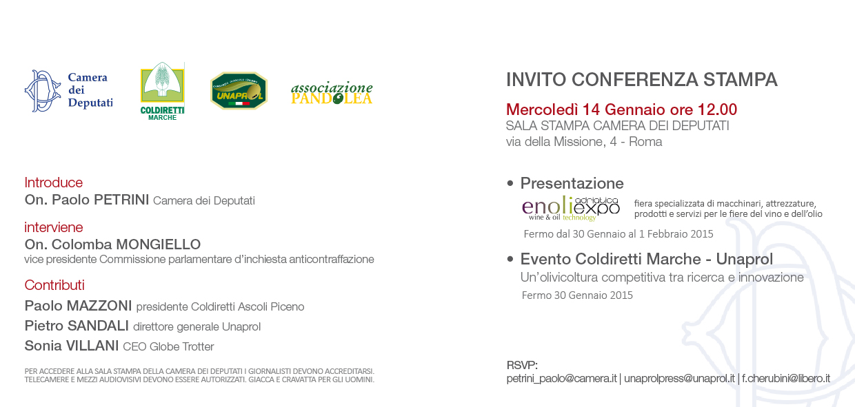 l’Italia è leader mondiale in tema di tecnologia dell’estrazione di olio di oliva.  Merito della ricerca scientifica, della grande tradizione olearia italiana, ma anche del contributo che Unaprol negli ultimi anni ha saputo trasferire all’intero settore utilizzando, come leva competitiva, la finalizzazione dei sostegni comunitari in regime di cofinanziamento con lo Stato italiano e le risorse degli stessi produttori. Se ne parlerà nella conferenza stampa di Enoliexpo Adriatica, fiera specializzata di macchinari ed attrezzature per il settore olivicolo ma anche del vino, che si svolgerà a Fermo dal 30 gennaio al 1° febbraio, Mercoledì 14 Gennaio ’15 alle ore 12,00 presso la sala stampa della Camera dei Deputati. Sarà anche l’occasione per presentare l’evento congiunto Coldiretti Marche e Unaprol sul tema della competitività in olivicoltura tra ricerca e innovazione che si terrà, sempre a Fermo, il prossimo 30 gennaio.