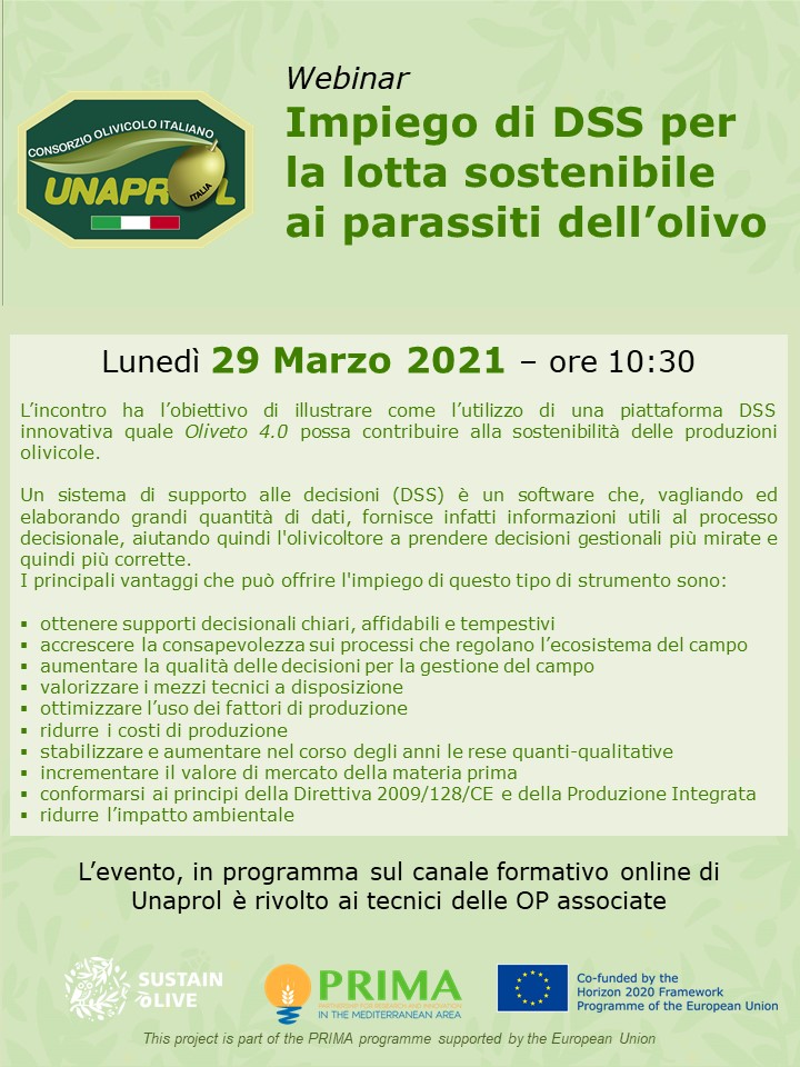 Unaprol, organizza un webinar dedicato alla possibilità di accrescere la sostenibilità delle produzioni olivicole mediante l’impiego di sistemi di supporto alle decisioni (DSS). Il webinar si terrà il 29 Marzo 2021 alle ore 10:30.