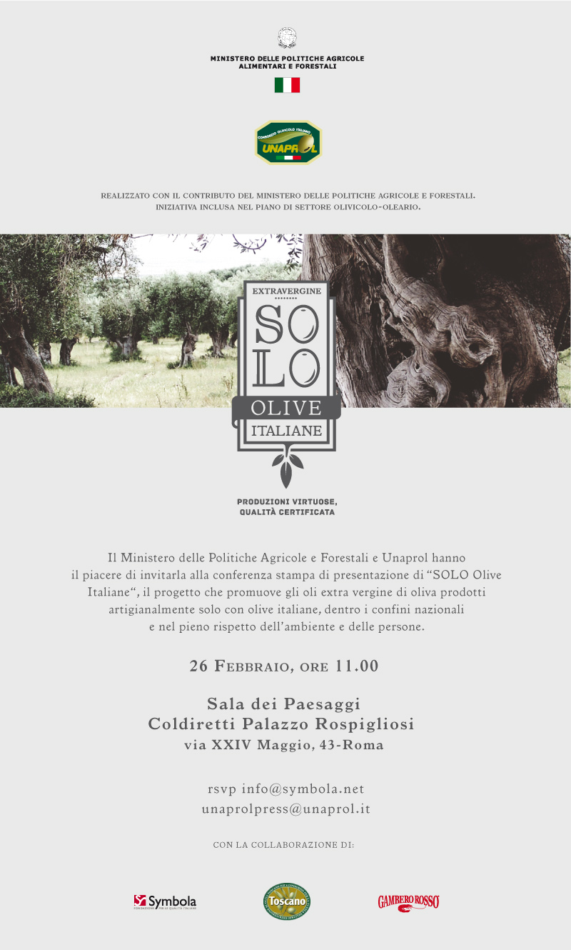 Mercoledì mattina 26 febbraio alle ore 11 presso la sala dei Paesaggi  di Palazzo Rospigliosi in via XXIV maggio 43, il Ministero delle politiche agricole, alimentari e forestali e l’Unaprol presenteranno alla stampa, ai consumatori e imprese SOLO OLIVE ITALIANE, produzioni virtuose e qualità certificata. L’iniziativa si inserisce nel programma di attività del piano di settore olivicolo – oleario. Per informazioni unaprolpress@unaprol.it