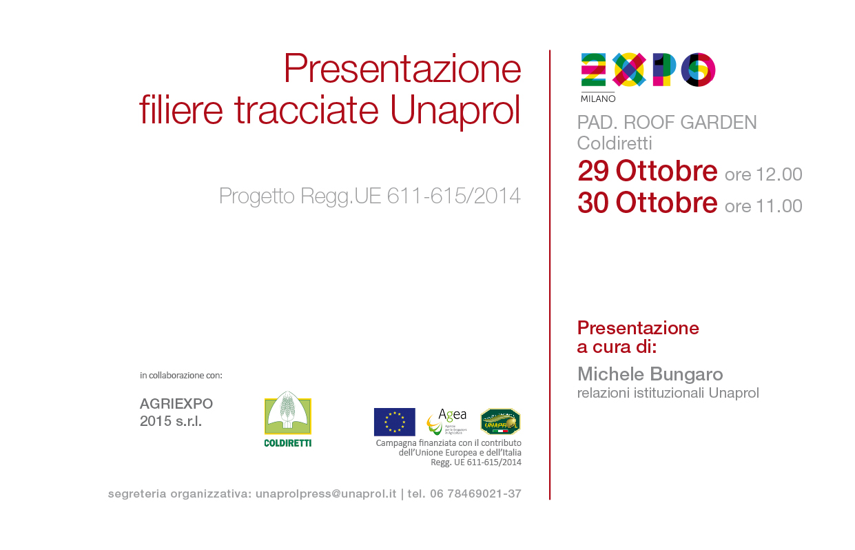 Il prossimo 29 ottobre alle ore 11 ed il 30 alle ore 12 si svolgeranno gli ultimi due incontri a cura di Unaprol con le filiere tracciate ad Expo 2015. Appuntamento presso l’area attrezzata Unaprol nell’area AgriExpo, all’ingresso Sud del Cardo ad EXPO 2015, Milano.
