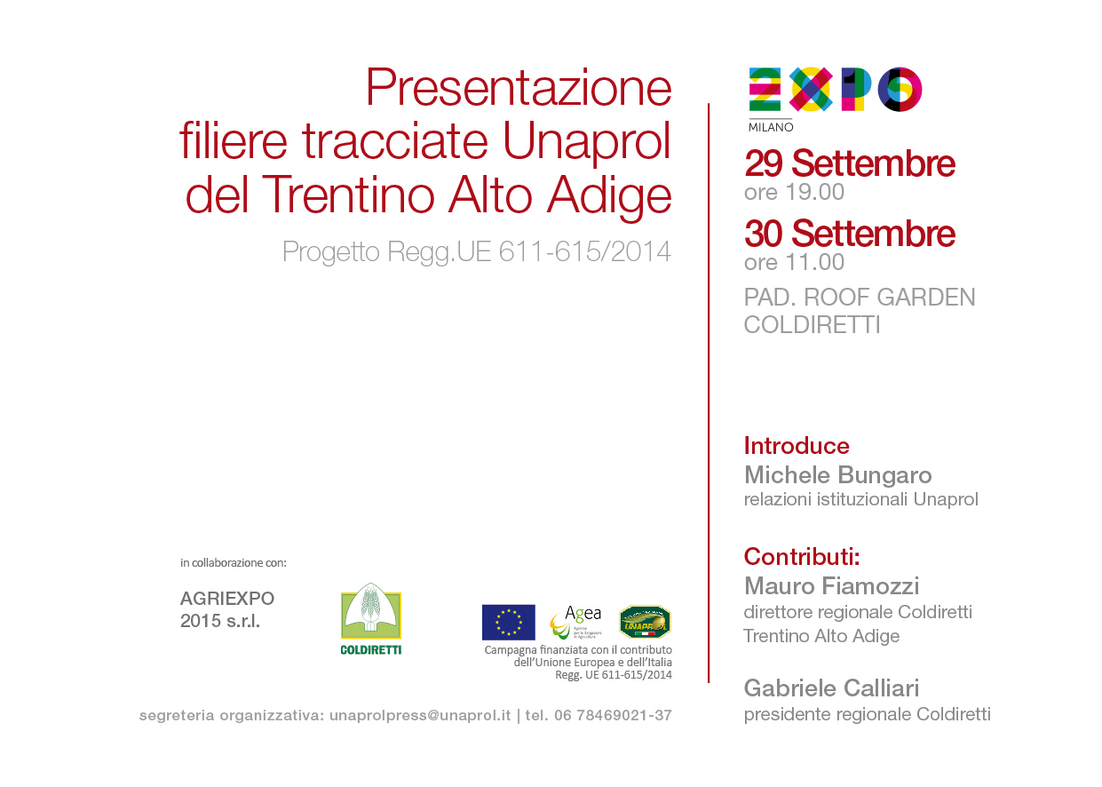 Nel viaggio tra le filiere tracciate Unaprol ad Expo 2015, questa è la settimana dedicata al Trentino Alto Adige. L’appuntamento è fissato alle ore 19.00 del 29 settembre e alle ore 11.00 del 30 settembre presso l’area attrezzata da Unaprol ad AgriExpo all’ingresso Sud del Cardo ad Expo. Interventi a cura di Mauro Fiamozzi e Gabriele Calliari, rispettivamente direttore e presidente regionale Coldiretti del Trentino Alto Adige. Introduzione a cura di Unaprol