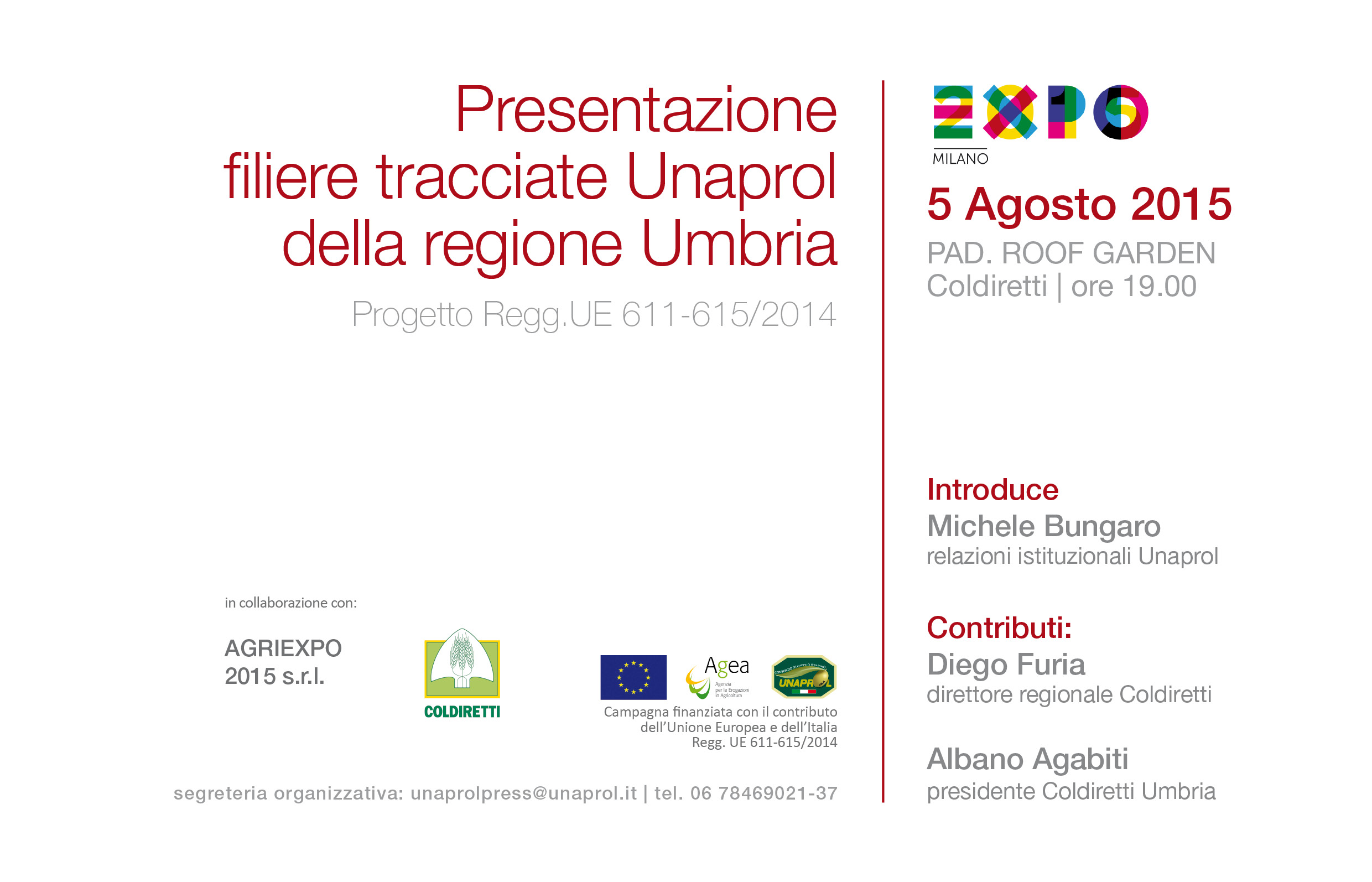 Nel viaggio tra le filiere tracciate Unaprol ad Expo 2015, questa è la settimana dedicata alla filiere tracciate della Regione Umbria. L’appuntamento è fissato alle ore 19,00 del 5 agosto presso l’area attrezzata da Unaprol ad AgriExpo all’ingresso Sud del Cardo ad Expo. Interventi a cura di Diego Furia e Albano Agabiti, rispettivamente direttore e presidente regionale coldiretti Umbria. Introduzione a cura di Unaprol. L’olivicoltura umbra rappresenta un fiore all’occhiello dell’olivicoltura nazionale per le sue caratteristiche qualitative e per la capacità di valorizzare il paesaggio circostante.