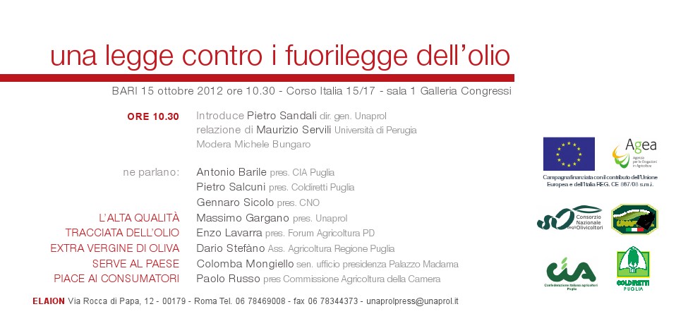 Lunedì mattina 15 ottobre a Bari, presso Galleria Congressi di Corso Italia, Cia e Coldiretti Puglia con le rispettive organizzazioni di produttori Cno e Unaprol lanciano la sfida anticontraffazione ai prestigiatori delle truffe e sofisticazioni del prodotto simbolo del made in Italy.