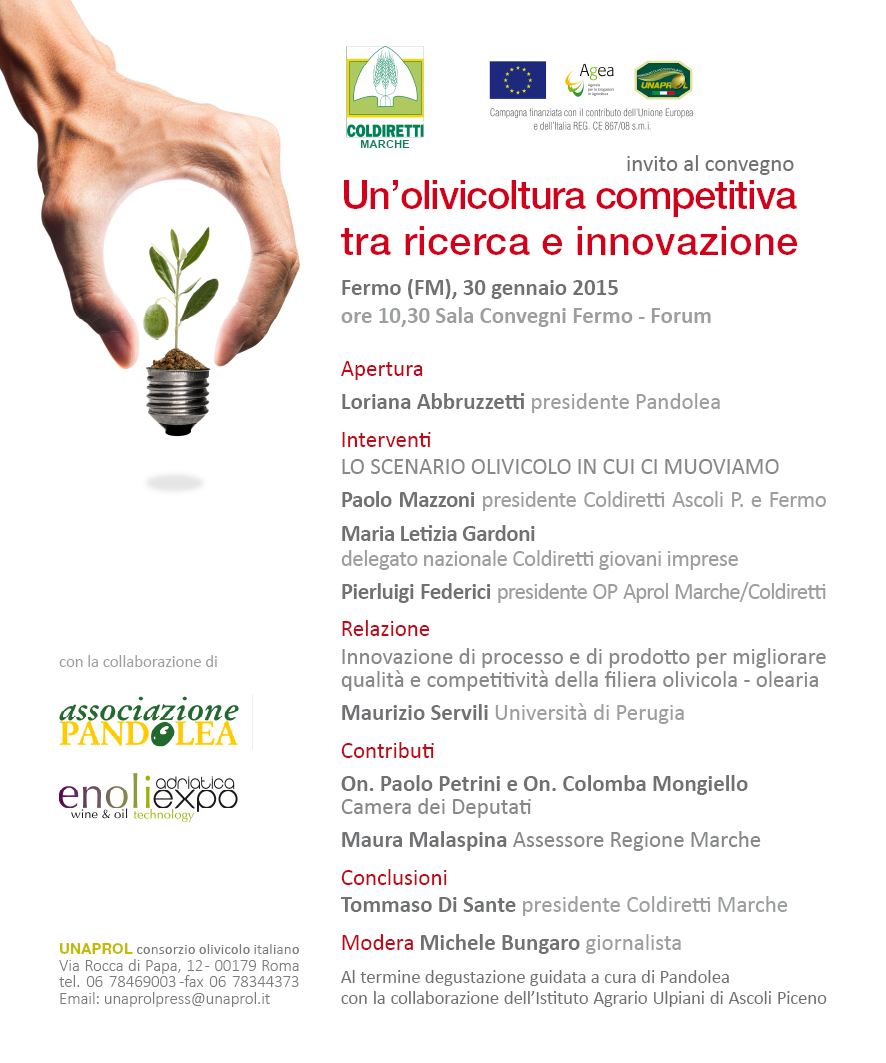Il prossimo 30 gennaio a Fermo, in occasione di Enoliexpo Adriatica, Coldiretti Marche ed Unaprol con la collaborazione di Pandolea organizzano un evento sul tema: “Un’olivicoltura competitiva tra ricerca e innovazione”. Esperti del settore, organizzazioni professionali e operatori olivicoli con il contributo della ricerca scientifica, del mondo universitario e l’impegno dei rappresentanti delle Istituzioni affrontano il tema della leadership italiana della tecnologia olearia in tutto il mondo.