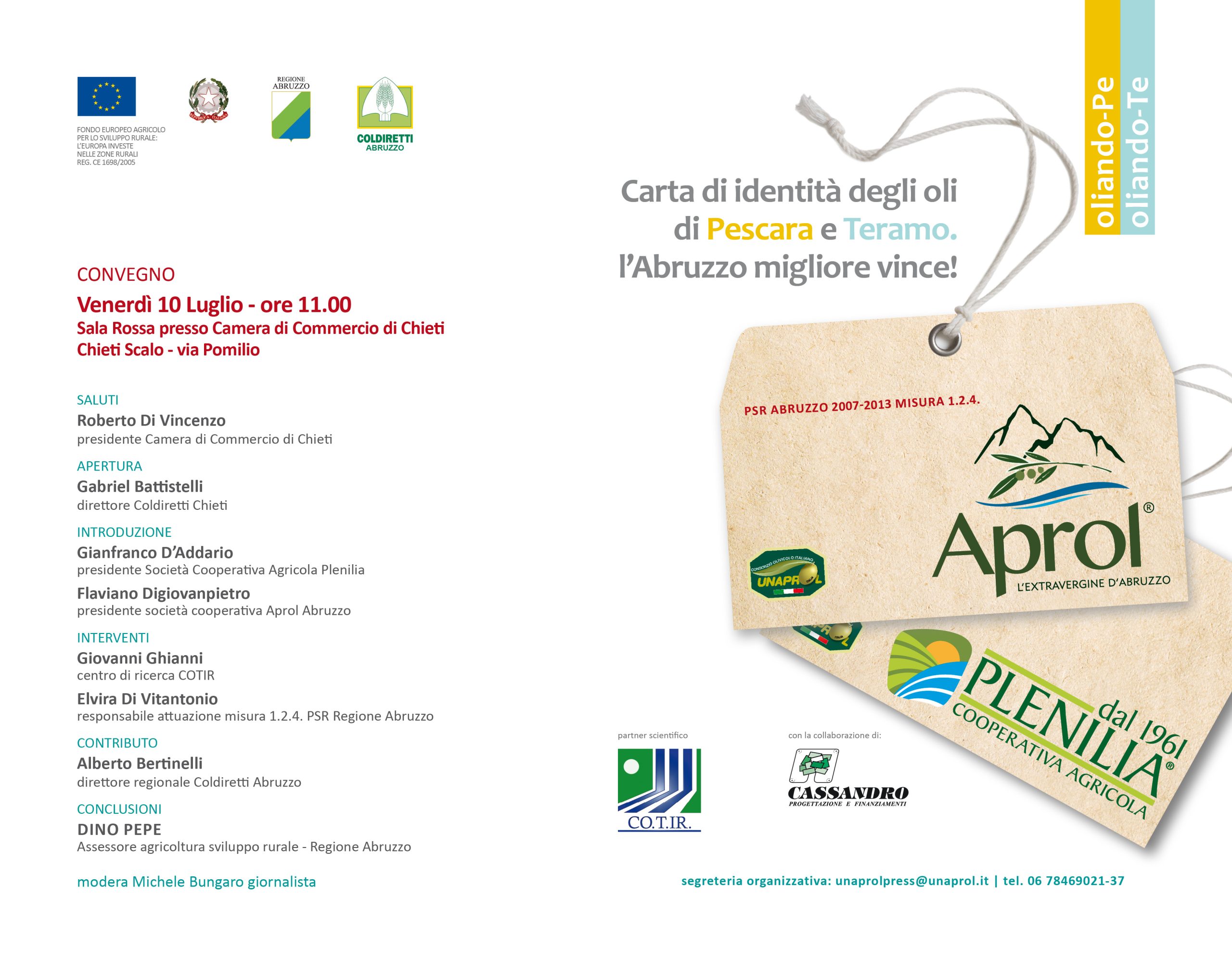 Domani mattina venerdì 10 luglio, alle 11, 00 presso la Sala Rossa della Camera di Commercio di Chieti, evento conclusivo per presentare i risultati dei due progetti Oliando TE e Oliando PE realizzati nell’ambito della misura 1.2.4. del PSR Abruzzo 2007/2013,  finalizzato per tracciare la prima google map degli oli extra vergine di oliva abruzzesi. Il progetto condotto con la collaborazione scientifica del COTIR ha visto come capofila due società cooperative: l’Aprol Abruzzo di Val Vibrata (TE) e la Plenilia di Pianella (PE). Entrambe le società fanno parte delle filiere tracciate da Unaprol  e organizzate da Coldiretti.
