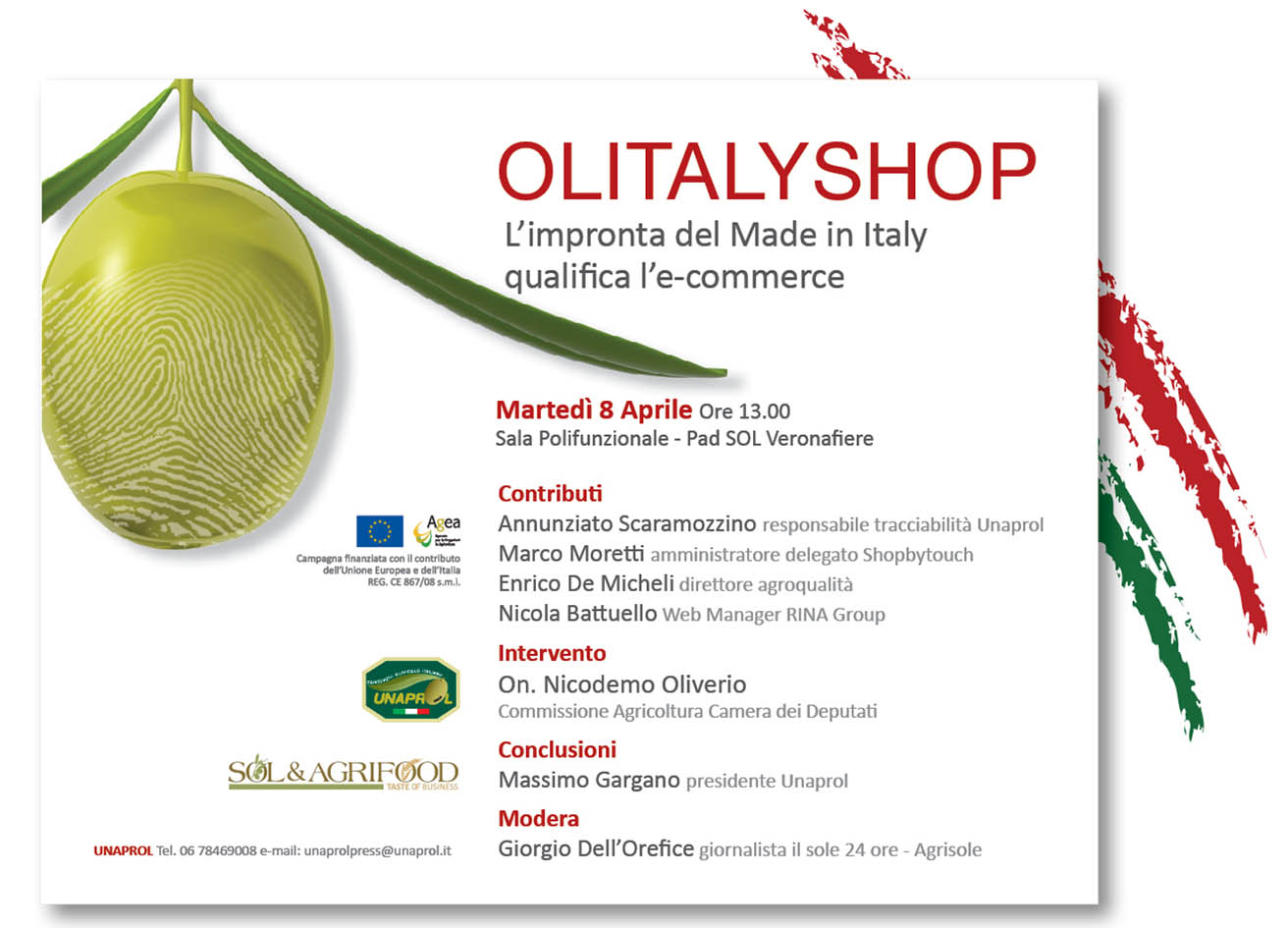Olitalyshop.it è il portale e-commerce dei produttori associati a Unaprol che accoglie i migliori oli extra vergine del nostro territorio, originali e non replicabili in altri posti del mondo. Il consumatore che sceglie l’acquisto on line ha la certezza dell’origine; acquista da chi produce le olive; contribuisce alla salvaguardia dell’ambiente e del territorio e porta a casa un olio extra vergine italiano unico. Gli oli extra vergine di Olitalyshop provengono solo dalle migliori varietà di olive, scelte dalle migliori aziende tutte inserite nel programma di tracciabilità di Unaprol. I prodotti vengono analizzati per accertarsi che rispondano ai rigidi standard del disciplinare di produzione Unaprol. Gli oli extra vergine di oliva sono poi certificati da un ente terzo per garantire al consumatore un prodotto 100% italiano, sicuro e di qualità. Tradotto in Inglese e tedesco e in futuro anche in cinese e giapponese, punta ad incrociare la domanda mondiale di alta qualità italiana che proviene da consumatori evoluti culturalmente e con buone capacità di acquisto alla ricerca di un’origine certa catturata dalla grande rete di internet.