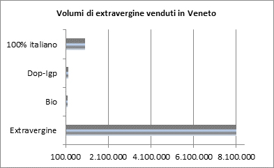 In base ai dati di vendita elaborati dall’osservatorio economico di Unaprol (fonte IRI), in Veneto, nel periodo gennaio-settembre 2014, sono stati venduti circa 8.000.000 di litri di extravergine, cui si aggiungono 180.000 litri di Bio, 214.000 litri di Dop e circa 1.000.000 litri di 100% italiano.