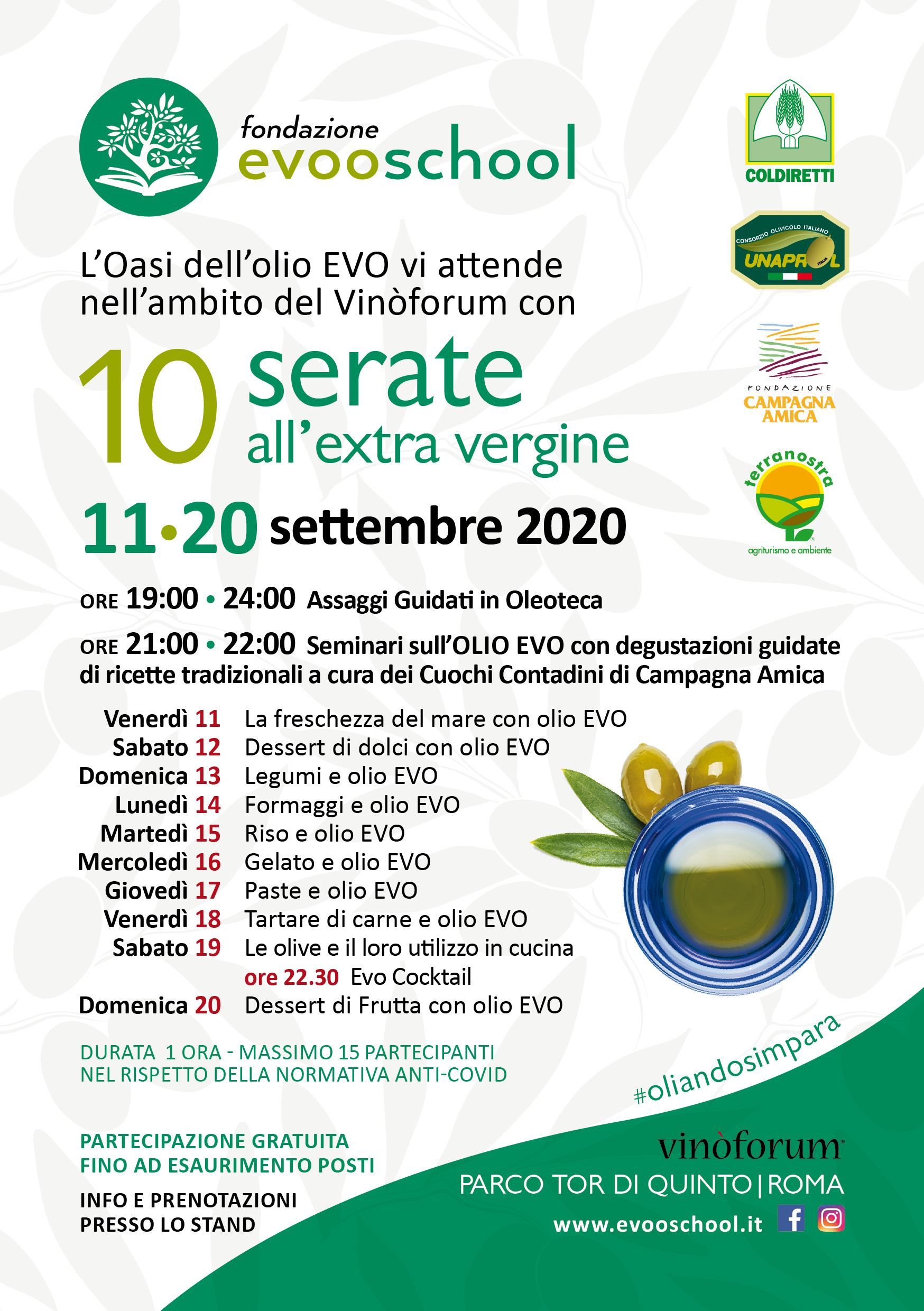 Unaprol, in collaborazione con Coldiretti, Fondazione Evoo School e Campagna Amica, gestirà lo spazio dedicato all’Olio Extravergine di Oliva durante Vinòforum, in programma a Roma da venerdì 11 a domenica 20 settembre 2020 in una location all’aria aperta d’eccezione: il Parco Tor di Quinto.