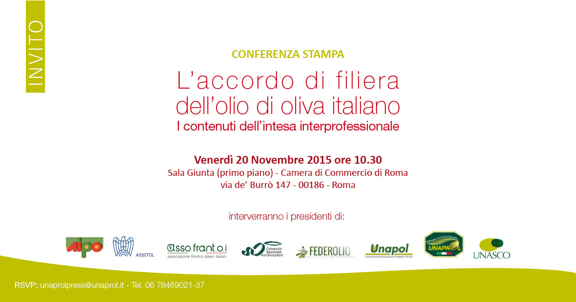 I contenuti del primo accordo di filiera, in Italia, dell’olio extra vergine di oliva siglato tra i rappresentanti dei produttori, industria, commercio e frantoiani, saranno illustrati alla stampa Venerdì mattina, 20 novembre 2015 alle ore 10,30, presso la sala Giunta della Camera di Commercio di Roma, 1° piano, in via de’ Burrò, 147.