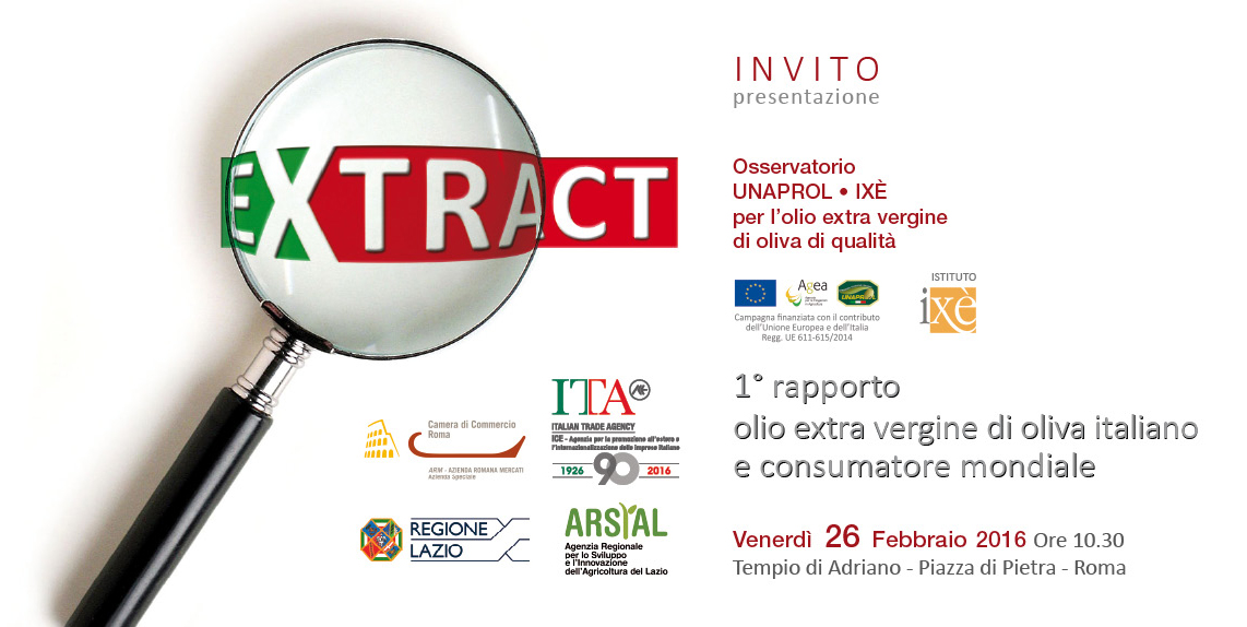 In particolare nel pomeriggio di Venerdì 26, dopo la presentazione del rapporto, vi saranno due momenti di approfondimento. Il primo dedicato a: come esportare vero olio extra vergine di oliva italiano negli USA, realizzato con la collaborazione di Agenzia ICE che per l’occasione ha curato l’incoming di buyer e giornalisti dagli Stati Uniti d’America. Il secondo riguarda la presentazione dell’idea progetto della costituzione del consorzio dell’olio extra vergine di oliva IGP ROMA, realizzato con la collaborazione di ARSIAL e Regione Lazio. Partner della due giorni di Unaprol sono l’Azienda Romana Mercati e la Camera di Commercio di Roma. Alla presentazione del 1° rapporto EXTRACT interverrà il Ministro delle politiche agricole alimentari e forestali, Maurizio Martina. Le conclusioni saranno del presidente di Coldiretti Roberto Moncalvo.